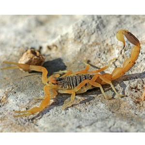 以色列金蝎,又称以色列杀人蝎,是世界公认的第一毒蝎,排名十大恐怖昆虫第五。其毒液的计量通常不足以杀死一位成年人,但对于小孩来说依然是致命的。它的毒液是多种神经毒素的混合物。这种最可怕的昆虫主要分布在中东和北非干燥的沙漠区,生长缓慢,体型纤细,拥有一对强力的大型螯肢,自诞生至今,便一直以凶残的习性和剧毒的尾刺闻名于世。