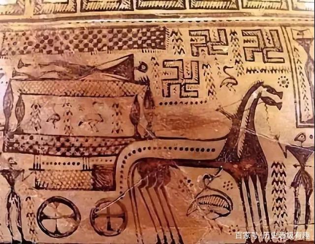 这个是古希腊人的彩陶器皿,古希腊人生活在西元前十到八史记的爱琴海一带,这个器物中也有很明显的“卍”字符。这个彩罐上描述的是送葬,三个“卍”字符在车头上方前方,是不是在指引往生者?
