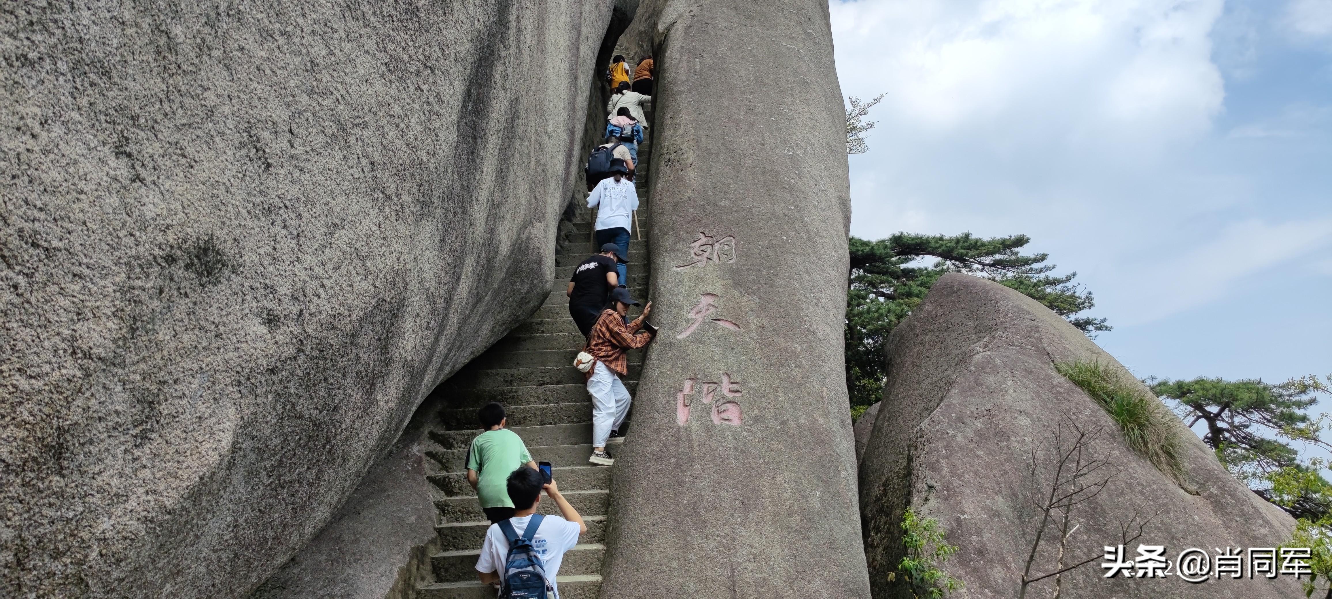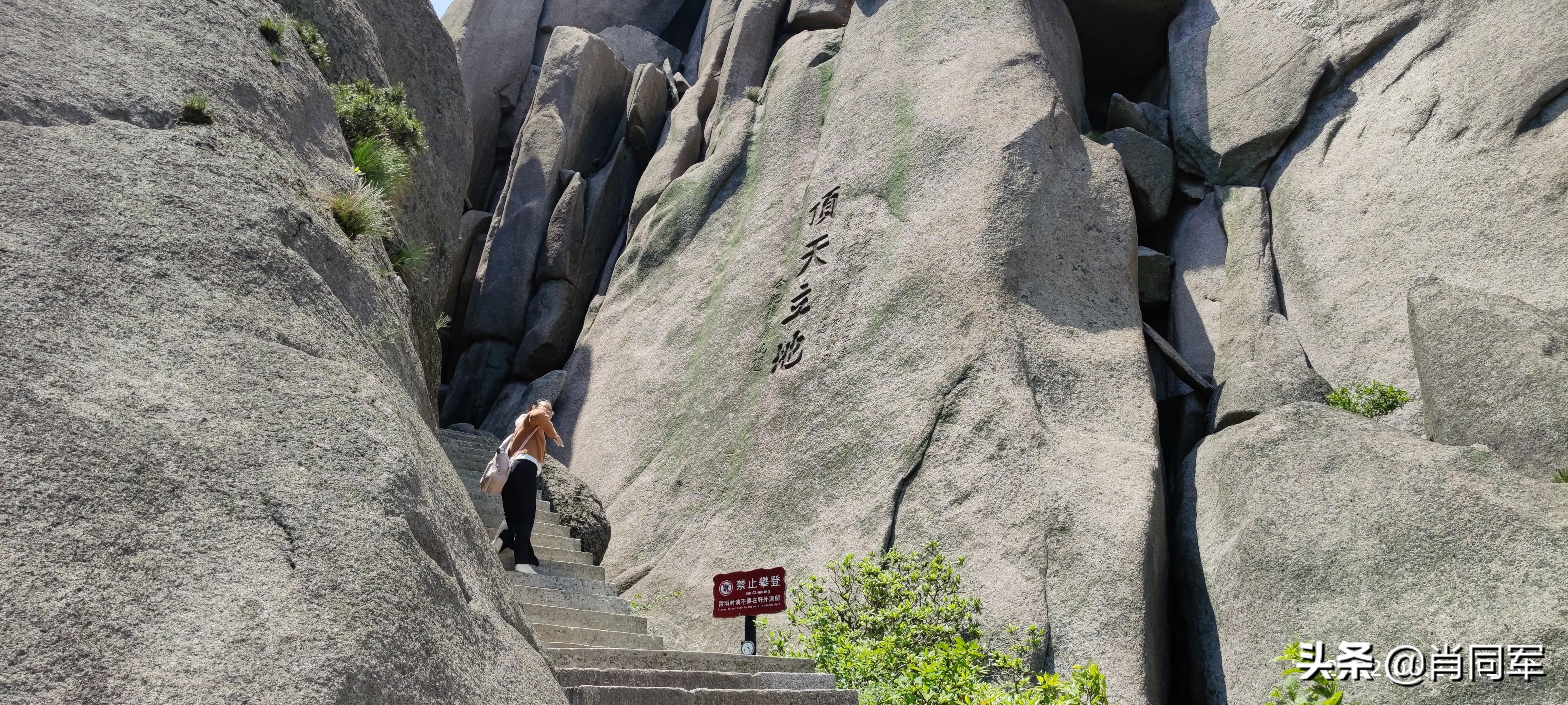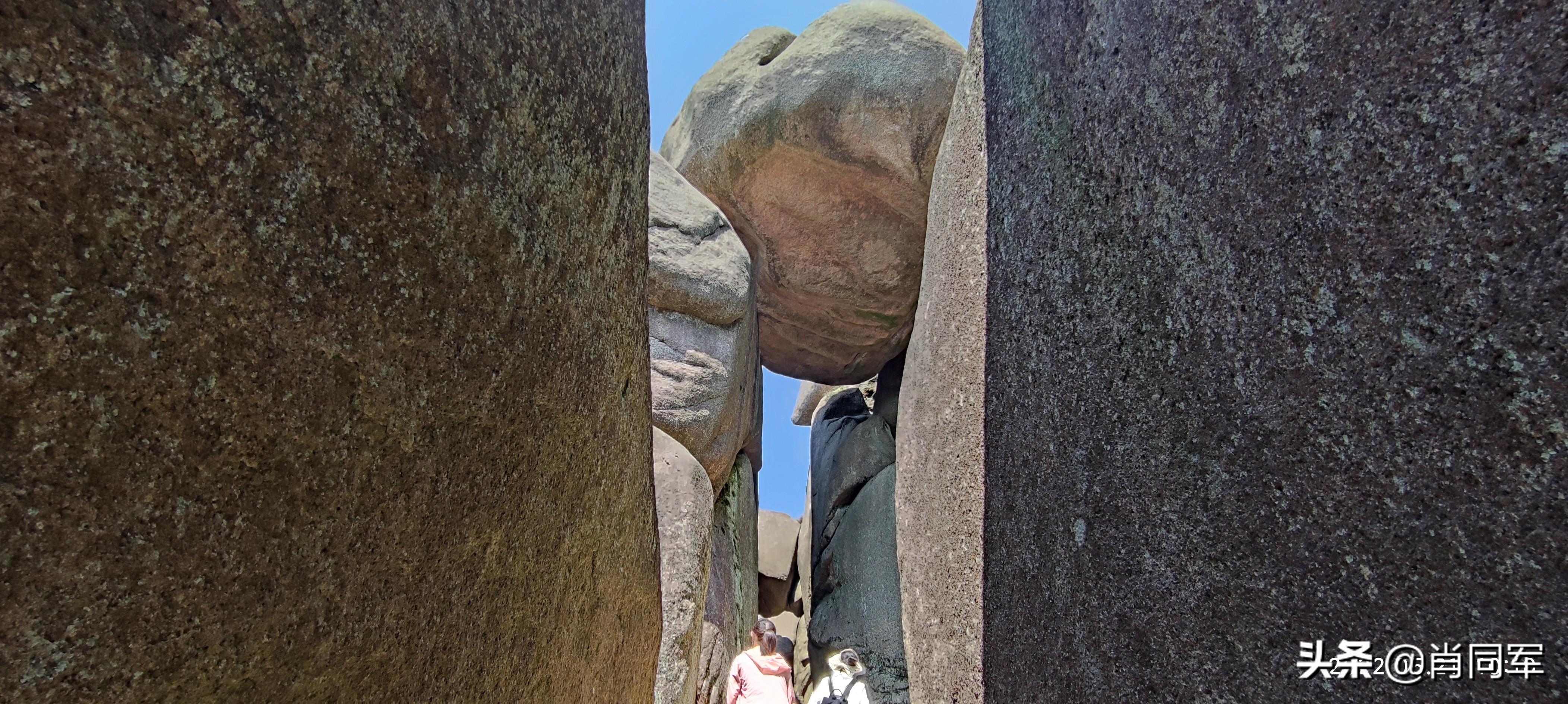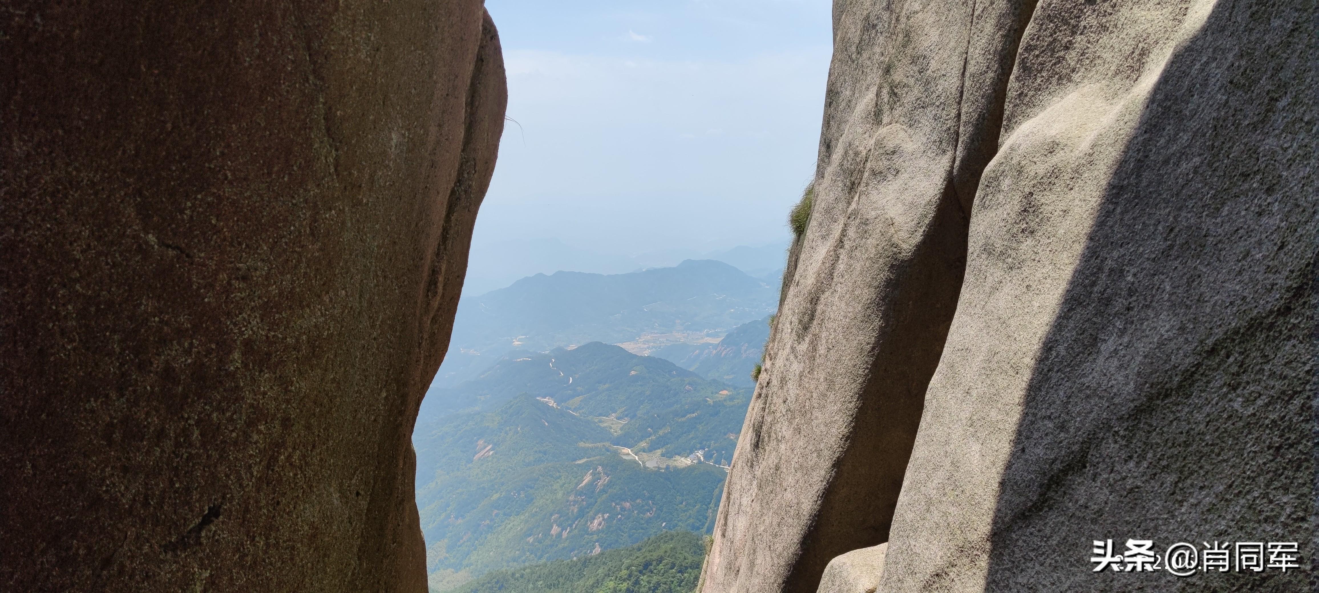 蓬莱峰左转是通往天柱峰的“一线天”,是景区里最靠近天柱峰的位置,与天柱峰最亲密接触。天柱峰,拔地而起,穿云破雾,直冲霄汉,海拔1488米。单论海拔高度,在大别山区的诸多高峰中算不上一流,但其从地壳内部突兀而出,没有草木、泥土覆盖,以天然石壁形态暴露于天地之间,其巍峨之雄姿在华夏大地占据鳌头。人能达到的位置,好像仅限于“一线天”,此处距离天柱峰顶尚有数百米,向上是垂直、光滑的石壁,不知道古今几人能成功登顶。那峰顶的八个大字“孤立擎霄,中天一柱“,是何人何时所题,如何登顶题写、篆刻对我也是个疑问。