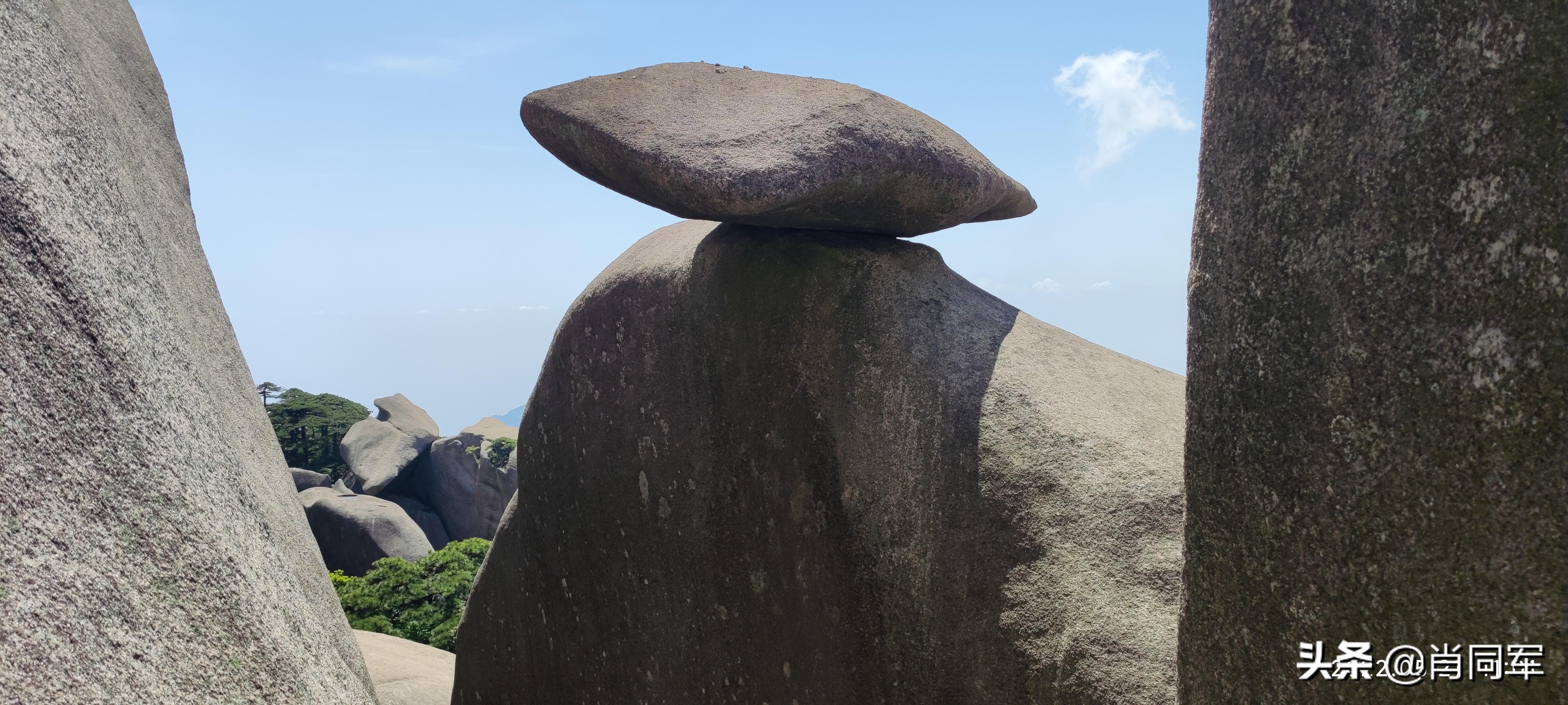 振衣冈往上,就到了总关寨岔路口,总关寨这条线,是单向通行,只能下不能上,有专人值守。上山沿着象鼻石、地宫到飞来石观景台。这飞来石,有两处,象是一个倒置的锅盖悬于石头峰顶之上,在阳光下熠熠生辉,在风吹日晒雨淋之下,不知过了多少年仍然近牢牢占据石头山峰的最高点。飞来石,是一种地质现象。石头山峰在亿万年的变迁中,顶部i逐渐风化、脱落,但有个别山峰顶部岩石在脱落过程中最顶部有个别部位因为位置、受力的关系,在顶部形成了盖帽般的孤立石块,形似天外来客,这就是飞来石。很快就到了天池峰,这是天柱山最热门的景点。