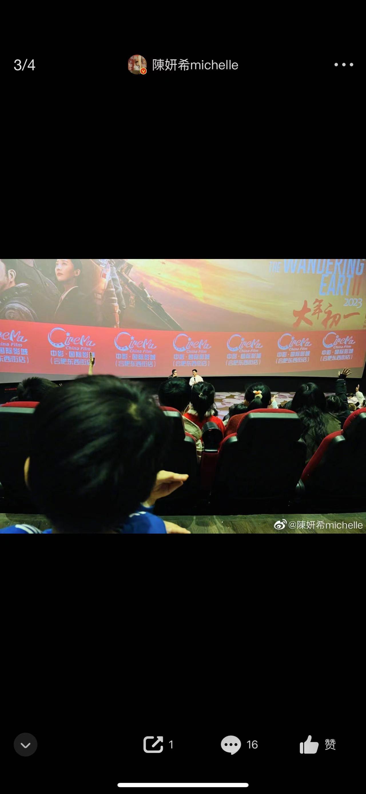 1月26日陈妍希晒出带着儿子小星星一起观看电影的合照,她在配文中写道:今日是第一次带陈星星去电影院看电影,选择的影片是《流浪地球2》,觉得特别有意义。