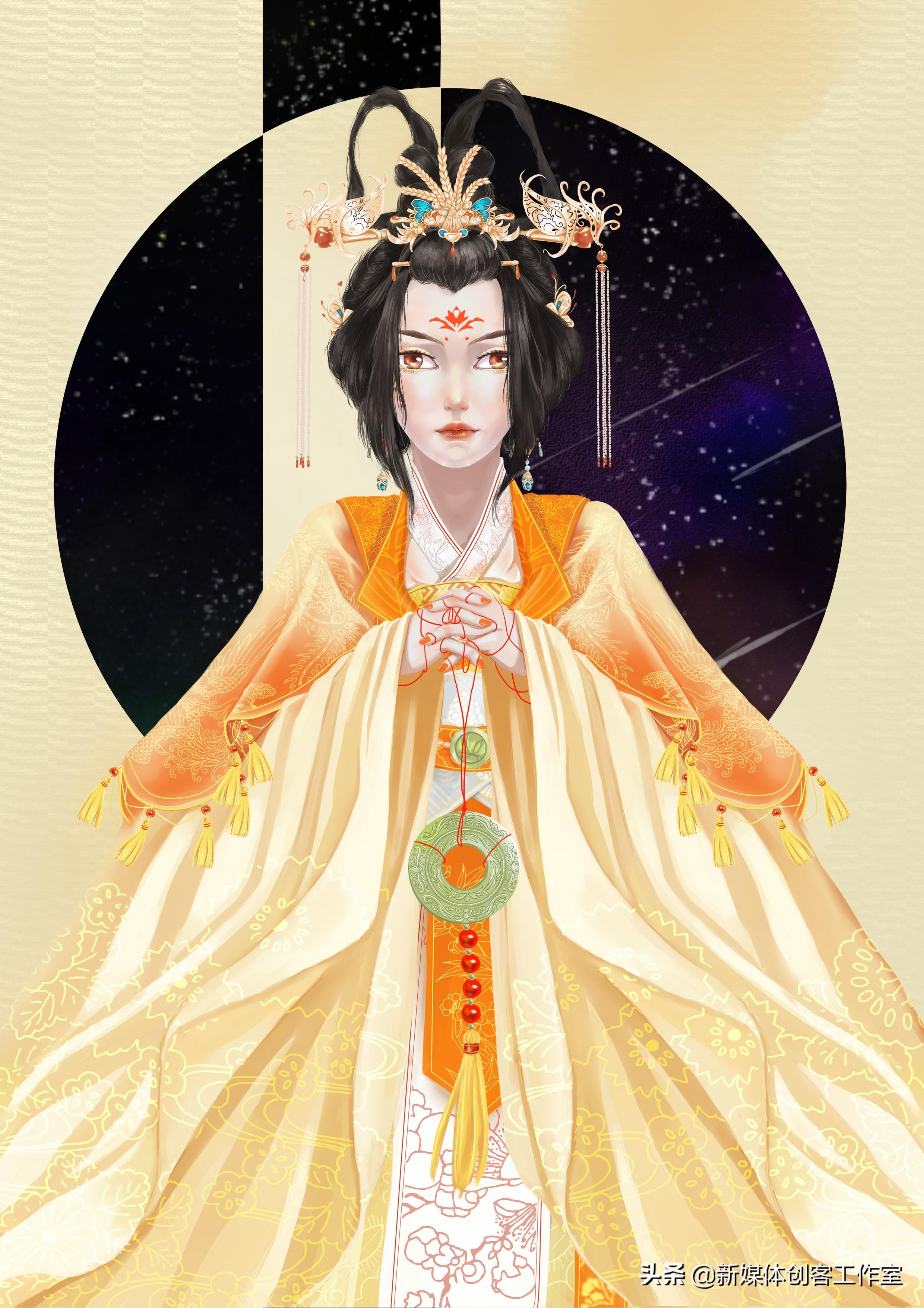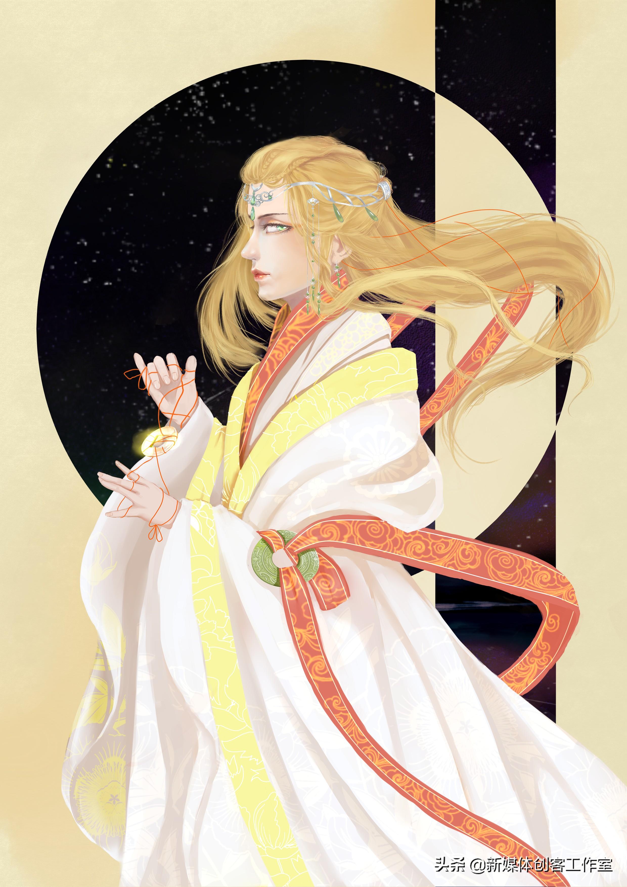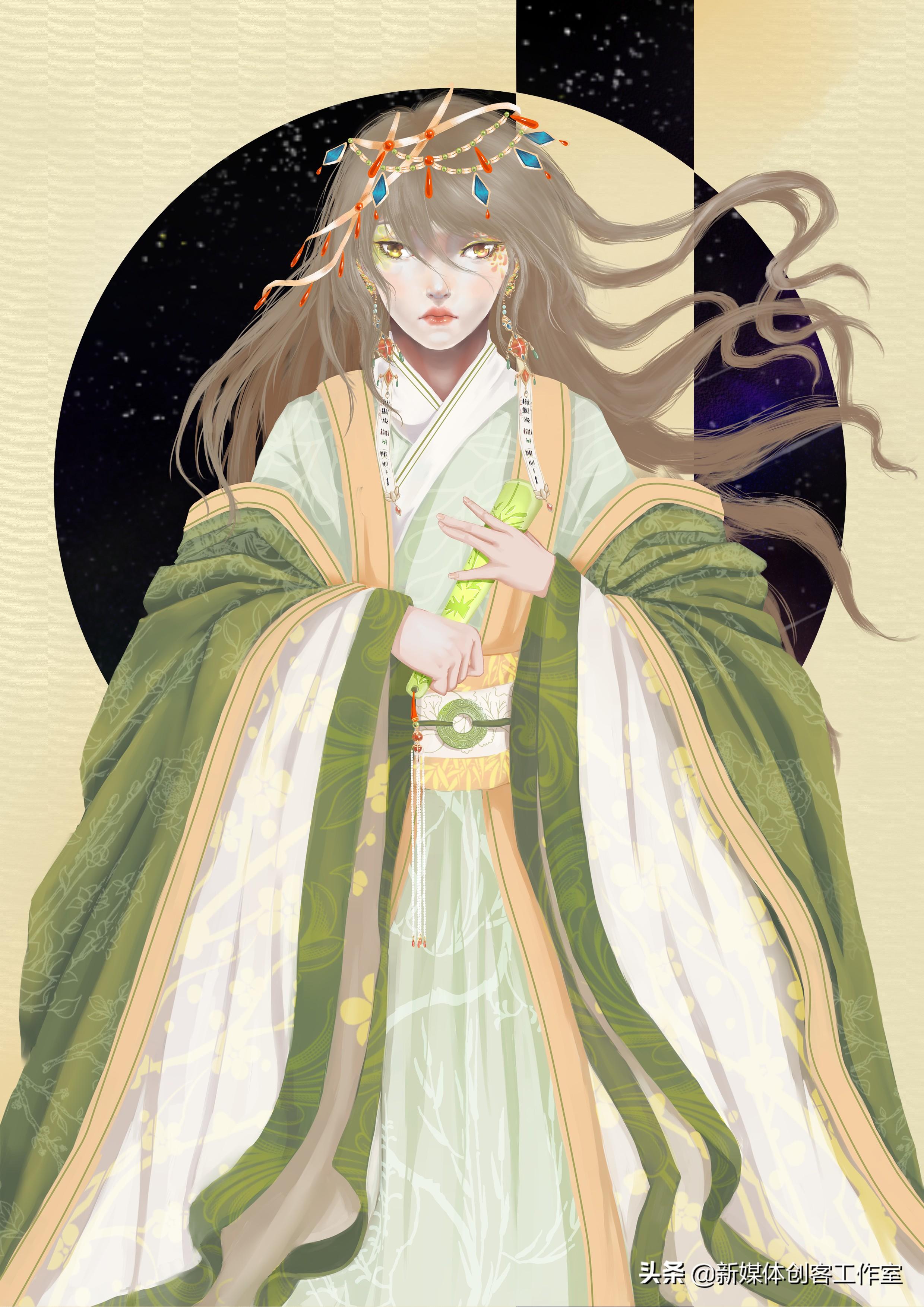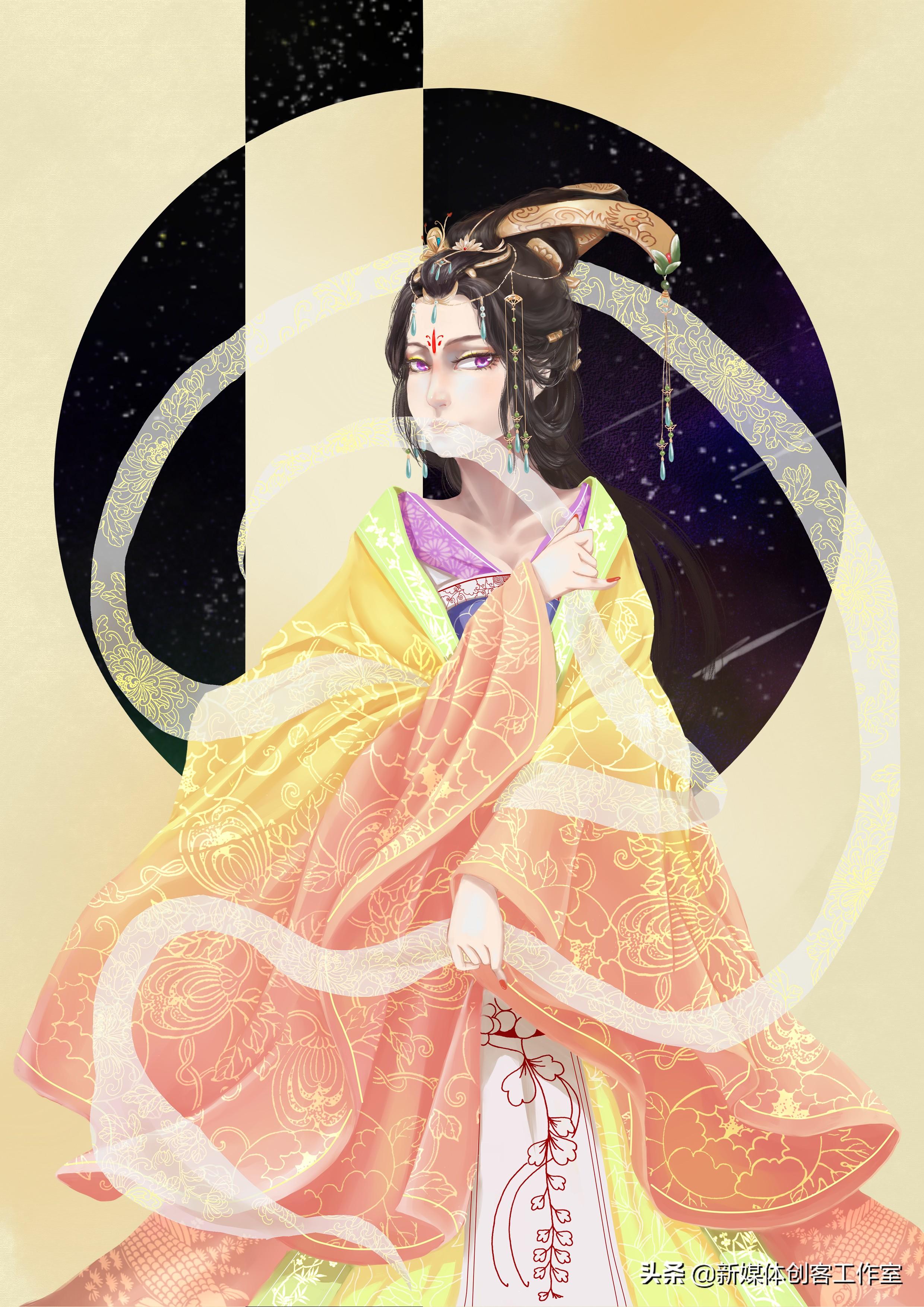 每张插画是根据每个星君的传说故事在进行构图,再根据其特性并结合中国传统服饰进行绘制。背景则通过简单的几何图形透出美丽的夜空。